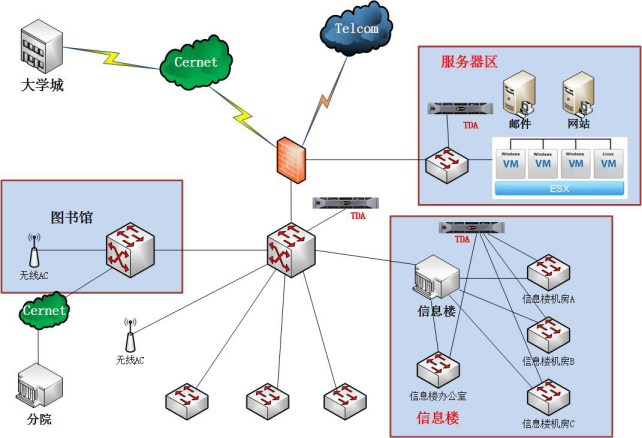 针对正处在日新月异的发展阶段的校园网络,英国威廉集团官网建议采用交换机镜像方式旁路部署信桅 深度威胁发现设备TDA,同时将该设备通过互联网接入亚信科技在上海设立的威胁监测中心,从而构建基于协议分析的APT发现及威胁管理系统,提供对于新生/未知威胁的识别,快速定位威胁源头的能力。